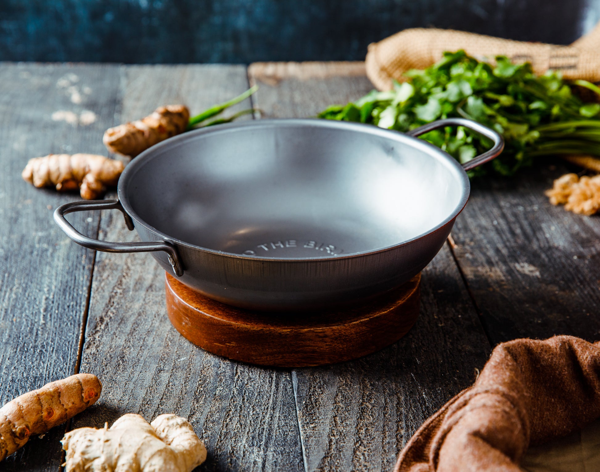 This set comes with two balti bowls and two bespoke mango wood stands- perfect for protecting your table from your piping hot balti pan.